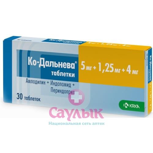 Ко-Дальнева - комбинированный препарат, содержащий периндоприла эрбумин (ингибитор ангиотензинпревращающего фермента (А11Ф)), индапамид (тиазидоподобный диуретик) и амлодипин (блокатор медленных кальциевых каналов (ВМКК)).Ко-Дальнева сочетает в себе свойства каждого из действующих веществ, которые обладают при этом потенцирующим действием.ФармакодинамикаАмлодипинАмлодипин - БМКК, производное дигидропиридина. Амлодипин ингибирует трансмембранный переход ионов кальция в кардиомиоциты и гладкомышечные клетки сосудистой стенки. Антигипертензивное действие амлодипина обусловлено прямым расслабляющим эффектом на гладкомышечные клетки сосудистой стенки. Механизм антиангинального действия амлодипина до конца не изучен, предположительно он связан со следующими эффектами:- вызывает расширение периферических артериол, снижая общее периферическое сосудистое сопротивление (ОПСС) - постнагрузку, что приводит к уменьшению потребности миокарда в кислороде,- вызывает расширение коронарных артерий и артериол как в интактных, так и в ишемизированных участках миокарда, что увеличивает поступление кислорода в миокард, в том числе у пациентов со стенокардией Принцметала.У пациентов с артериальной гипертензией (АГ) прием амлодипина 1 раз в сутки обеспечивает клинически значимое снижение артериального давления (АД) (в положении лежа и стоя) в течение 24 часов. Антигипертензивное действие развивается медленно, в связи с чем, развитие острой артериальной гипотензии нехарактерно. У пациентов со стенокардией прием амлодипина 1 раз в сутки повышает толерантность к физической нагрузке, время до развития приступа стенокардии и до ишемической депрессии сегмента ST, снижает частоту приступов стенокардии и потребность в приеме нитроглицерина (короткодействующие формы). Амлодипин не оказывает влияния на показатели липидного профиля и не вызывает изменения гиполипидемических показателей плазмы крови. Препарат может применяться у пациентов с бронхиальной астмой (БА), сахарным диабетом (СД) и подагрой.ИндапамидИндапамид является производным сульфонамида. По фармакологическим свойствам близок к тиазидным диуретикам. Индапамид ингибирует реабсорбцию ионов натрия в кортикальном сегменте петли Генле, что приводит к увеличению экскреции почками ионов натрия и хлора, и в меньшей степени ионов калия и магния, усиливая тем самым диурез и снижая АД.В режиме монотерапии антигипертензивное действие сохраняется в течение 24 часов и проявляется при применении препарата в дозах, оказывающих минимальное диуретическое действие. Антигипертензивное действие индапамида связано е улучшением эластических свойств крупных артерий, уменьшением ОПСС. На фоне приема индапамида уменьшается гипертрофия левого желудочка (ГЛЖ). Индапамид не влияет на концентрацию липидов в плазме крови (триглицеридов, общего холестерина,липопротеинов низкой и высокой плотности), на показатели углеводного обмена (в том числе у пациентов с СД).ПериндоприлПериндоприл - ингибитор ангиотензинпревращающего фермента. АПФ, или кининаза II, является экзопептидазой, которая превращает ангиотензин I в сосудосуживающее вещество - ангиотензин II, а также разрушает брадикинин, обладающий сосудорасширяющими свойствами, до неактивного гептапептида.В результате периндоприл обеспечива