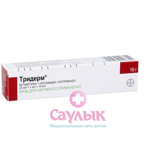 Комбинированный препарат для наружного применения.Мазь ТРИДЕРМ сочетает в себе противовоспалительный, противозудный, противоаллергический и антиэкссудативный эффект глюкокортикостероида (ГКС) бетаметазона дипропионата с противогрибковой активностью клотримазола и широким антибактериальным действием гентамицина сульфата.Клотримазол оказывает противогрибковое действие за счет нарушения синтеза эргостерина, являющегося составной частью клеточной мембраны грибов. Активен в отношении Trichophyton rubrum, Trichophyton mentagrophytes, Epidermophyton floccosum, Microsporum canis, Candida albicans, Malassezia furfur (Pityrosporum obiculare).Гентамицин является антибиотиком широкого спектра действия из группы аминогликозидов. Действует бактерицидно и обеспечивает высокоэффективное местное лечение первичных и вторичных бактериальных инфекций кожи. Активен в отношении грамотрицательных бактерий: Pseudomonas aeruginosa, Enterobacter aerogenes, Escherichia coli, Proteus vulgaris и Klebsiella pneumoniae, грамположительных бактерий: Staphylococcus aureus (коагулаза-положительные, коагулаза-отрицательные и некоторые штаммы, продуцирующие пенициллиназу).