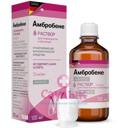 Купить АМБРОБЕНЕ Р-Р Д/ПРИЕМА ВНУТРЬ И ИНГАЛ. 7.5МГ/МЛ 100МЛ №1 В КОМПЛЕКТЕ СО СТАКАНЧИКОМ МЕРНЫМ в Казани