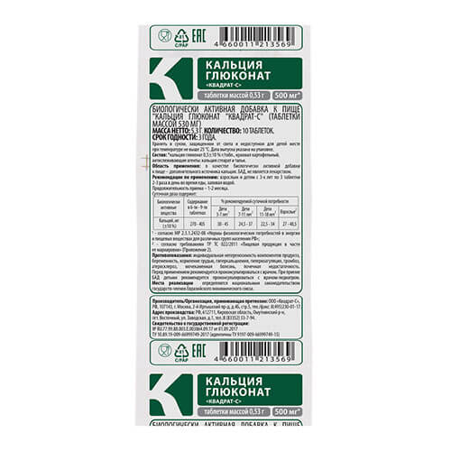 Купить КАЛЬЦИЯ ГЛЮКОНАТ 500МГ. №10 ТАБ. (БАД) /КВАДРАТ С/ в Казани
