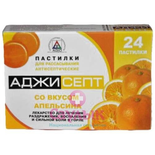 Аджисепт®, таблетки для рассасывания [апельсиновые]. Оранжевые круглые двояковыпуклые таблетки с преобладающим запахом апельсина, допускается неоднородность окрашивания, наличие незначительных пузырьков воздуха в карамельной массе и незначительные неровности краев.