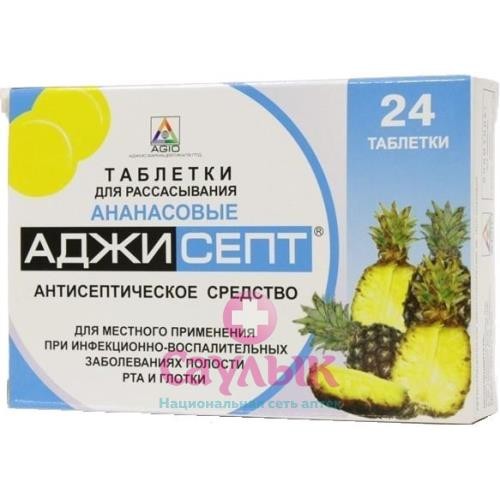 Аджисепт®, таблетки для рассасывания [ананасовые]. Активный ингредиент: 2,4-дихлорбензиловый спирт 1,2 мг Амилметакрезол 0,6 мг Вспомогательные ингредиенты: Сахароза, декстроза, лимонная кислота безводная, ментол, ананасовый ароматизатор, краситель хинолиновый желтый, вода очищенная.