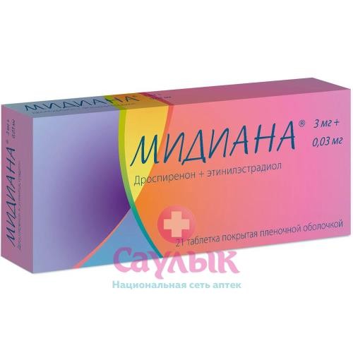 Таблетки необходимо принимать каждый день примерно в одно и то же время, при необходимости запивая небольшим количеством жидкости, в последовательности, указанной на блистерной упаковке. Необходимо принимать по одной таблетке в день в течение 21 дня подряд. Прием таблеток из каждой последующей упаковки должен начинаться после 7-дневного интервала в приеме таблеток, в течение которого обычно наступает менструальноподобное кровотечение. Оно обычно начинается через 2-3 дня после приема последней таблетки и может не закончиться к моменту начала следующей упаковки.Как принимать препарат МИДИАНАЕсли ранее гормональные контрацептивы не применялись (в последний месяц): Прием комбинированных пероральных контрацептивов начинается в первый день естественного менструального цикла женщины (то есть в первый день менструального кровотечения).В случае замены другого комбинированного перорального контрацептива, вагинального кольца или трансдермального пластыря:Для женщины предпочтительно начать прием препарата МИДИАНА на следующий день после приема последней активной таблетки предыдущего комбинированного перорального контрацептива, в таких случаях прием лекарственного средства МИДИАНА не должен начинаться позднее следующего дня после обычного перерыва в приеме таблеток или приема неактивных таблеток ее предыдущего комбинированного перорального контрацептива. При замене вагинального кольца или трансдермального пластыря прием перорального контрацептива МИДИАНА желательно начинать в день удаления предыдущего средства, в таких случаях прием препарата МИДИАНА должен начаться не позднее дня намеченной процедуры замены.В случае замены метода с применением только прогестинов (мини-пили, инъекционные формы, имплантаты) или внутриматочных контрацептивов с высвобождением прогестинов:Женщина может перейти с мини-пили в любой день (с имплантата или внутриматочного контрацептива - в день его удаления, с инъекционной формы - со дня, когда должна была быть сделана следующая инъекция). Однако во всех этих случаях желательно использовать дополнительно барьерный метод контрацепции в течение первых 7 дней приема таблеток.После прерывания беременности в первом триместре:Женщина может начать прием немедленно. При соблюдении этого условия нет необходимости в дополнительных мерах контрацепции.После родов или прерывания беременности во втором триместре:Женщине желательно начать прием препарата МИДИАНА на 21-28 день после родов или прерывания беременности во втором триместре. Если прием начат позднее, необходимо использовать дополнительно барьерный метод контрацепции в течение первых 7 дней приема таблеток. В случае наличия полового контакта до начала приема препарата должна быть исключена беременность или необходимо дождаться первой менструации.Прием пропущенных таблетокЕсли опоздание в приеме таблетки составило менее 12 часов, контрацептивная защита не снижается. Женщине необходимо принять таблетку как можно скорее, следующие таблетки принимаются в обычное время.Если опоздание в приеме таблеток составило более 12 часов, контрацептивная защита может быть снижена. Тактика при пропуске приема препарата основывается на следующих двух простых правилах:1. Прием таблеток нельзя прекращать более чем на 7 дней,2. Чтобы достичь