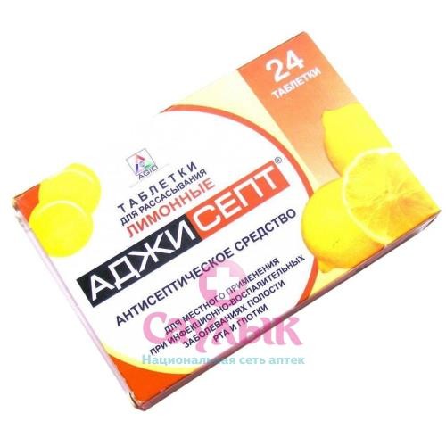 Аджисепт ® , таблетки для рассасывания [лимонные]. Активный ингредиент: 2,4-дихлорбензиловый спирт 1,2 мг Амилметакрезол 0,6 мг Вспомогательные ингредиенты: Сахароза, декстроза, лимонная кислота безводная, ментол, ароматизатор лимонный, краситель солнечный закат желтый, краситель хинолиновый желтый, вода очищенная.