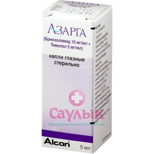 Абсорбция При местном применении бринзоламид и тимолол проникают в системный кровоток. Максимальная концентрация Стах бринзоламида в эритроцитах около 18,4 рМ. В равновесном состоянии, после применения препарата Азарга средняя максимальная концентрация Сmах тимолола в плазме и AUC0-124 тимолола составляла 0,824 0,453 нг/мл и 4,71 4,29нг*ч/мл, соответственно, а средняя Стах тимолола была достигнута при 0,79 0,45 ч.Распределение Бринзоламид умеренно связывается с белками плазмы (около 60%) и накапливается в эритроцитах в результате избирательного связывания с карбоангидразой II и, в меньшей степени, с карбоангидразой I. Его активный метаболит N-дезэтилбринзоламид также накапливается в эритроцитах, где связывается преимущественно с карбоангидразой I. Благодаря сродству бринзоламида и его метаболита к эритроцитам и тканевой карбоангидразе их концентрация в плазме низкая.Метаболизм Метаболизм бринзоламида происходит путем N-деалкилирования, О-деалкилирования и окисления N-пропиловой боковой цепи. Основной метаболит - N-дезэтилбринзоламид, в присутствии бринзоламида, связывается с карбоангидразой I и также накапливается в эритроцитах. Исследования in vitro показали, что за метаболизм бринзоламида отвечает, главным образом, изофермент CYP3A4, а также изоферменты CYP2A6, CYP2B6, CYP2C8 и CYP2C9. Метаболизм тимолола происходит двумя путями: с образованием этаноламинной боковой цепи на тиадиазольном кольце и с формированием этанольной боковой цепи у азота морфолина и аналогичной боковой цепи с карбонильной группой, соединенной с азотом. Метаболизм тимолола осуществляется главным образом CYP2D6.Выведение Бринзоламид выводится, в основном, с мочой и калом в сравнительных количествах, 32 % и 29 %, соответственно. Около 20 % выводится в виде метаболитов с мочой. В моче обнаруживаются, в основном, бринзоламид и N-дезэтилбринзоламид, а также остаточные количества (<,1 %) других метаболитов (N-дезметоксипропила и О-дезметила). Тимолол и его метаболиты выводятся в основном почками. Около 20 % тимолола выводится с мочой в неизменном виде, остальная часть - в виде метаболитов. Т1/2 тимолола составляет 4,8 ч после местного применения препарата Азарга.