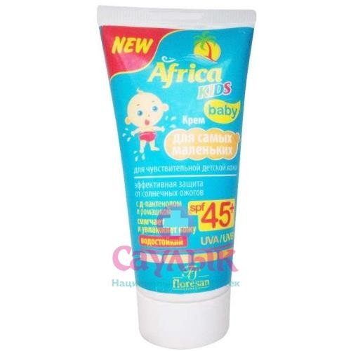 Крем для самых маленьких, для чувствительной детской кожи SPF 45+ «Africa Kids».Формула: 411Солнцезащитная серия «Africa kids» разработана специально для чувствительной детской кожи. Нежные водостойкие средства от солнца содержат соединения фильтров UVA и UVB , защищающих кожу детей от вредного воздействия солнечных лучей и свободных радикалов. Водостойкая формула обеспечивает оптимальную защиту кожи на длительный срок во время пребывания на солнце и после водных процедур. Средства после загара эффективно увлажняют и успокаивают кожу ребенка после принятия солнечных ванн.Нежный крем серии «Africa kids» создан специально для сверхчувствительной к солнцу детской кожи при нахождении, как на суше, так и в воде.