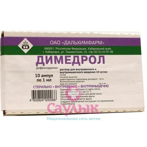 Купить ДИМЕДРОЛ 1% 10МГ/МЛ. 1МЛ. №10 Р-Р Д/В/В, В/М АМП. /ДАЛЬХИМФАРМ/ в Казани